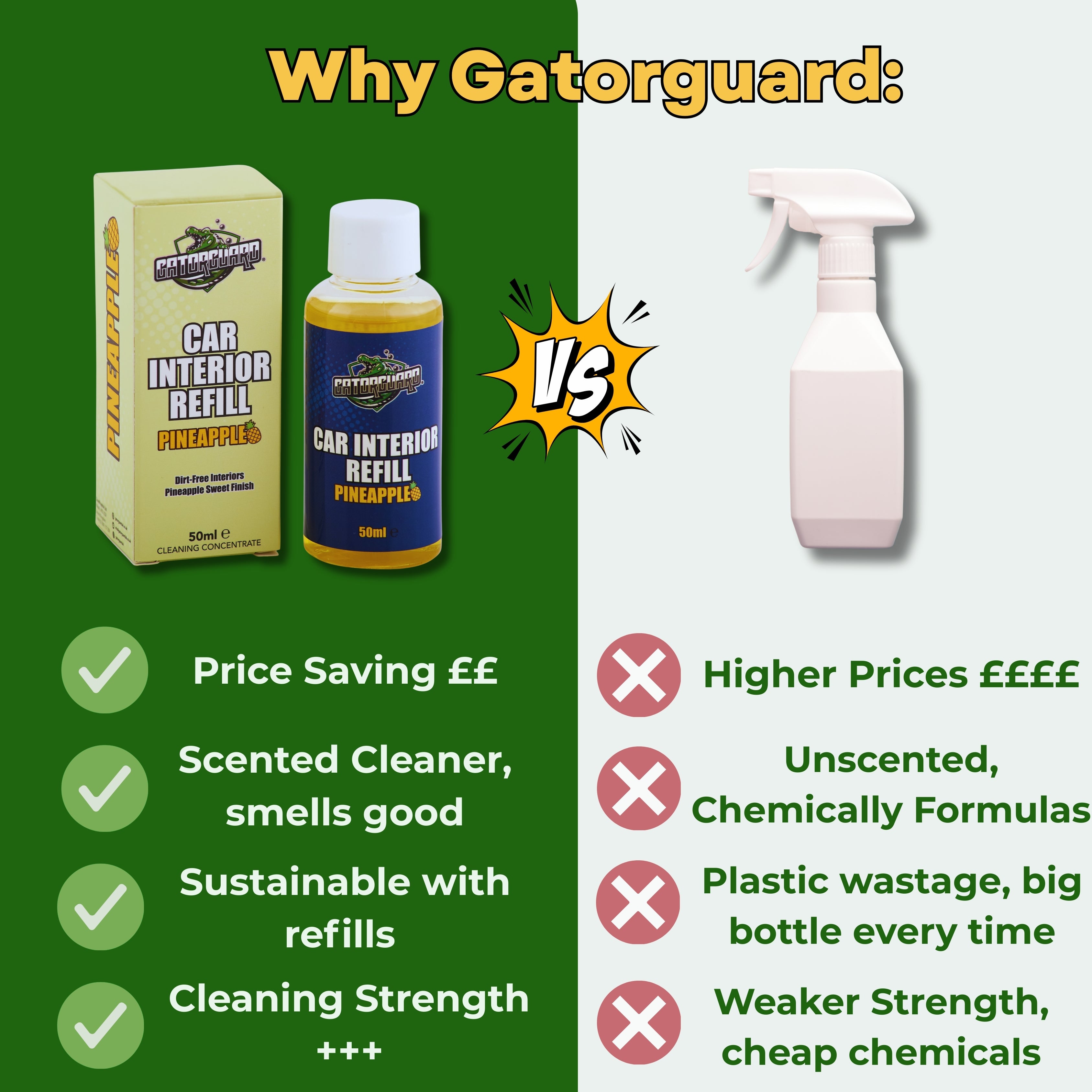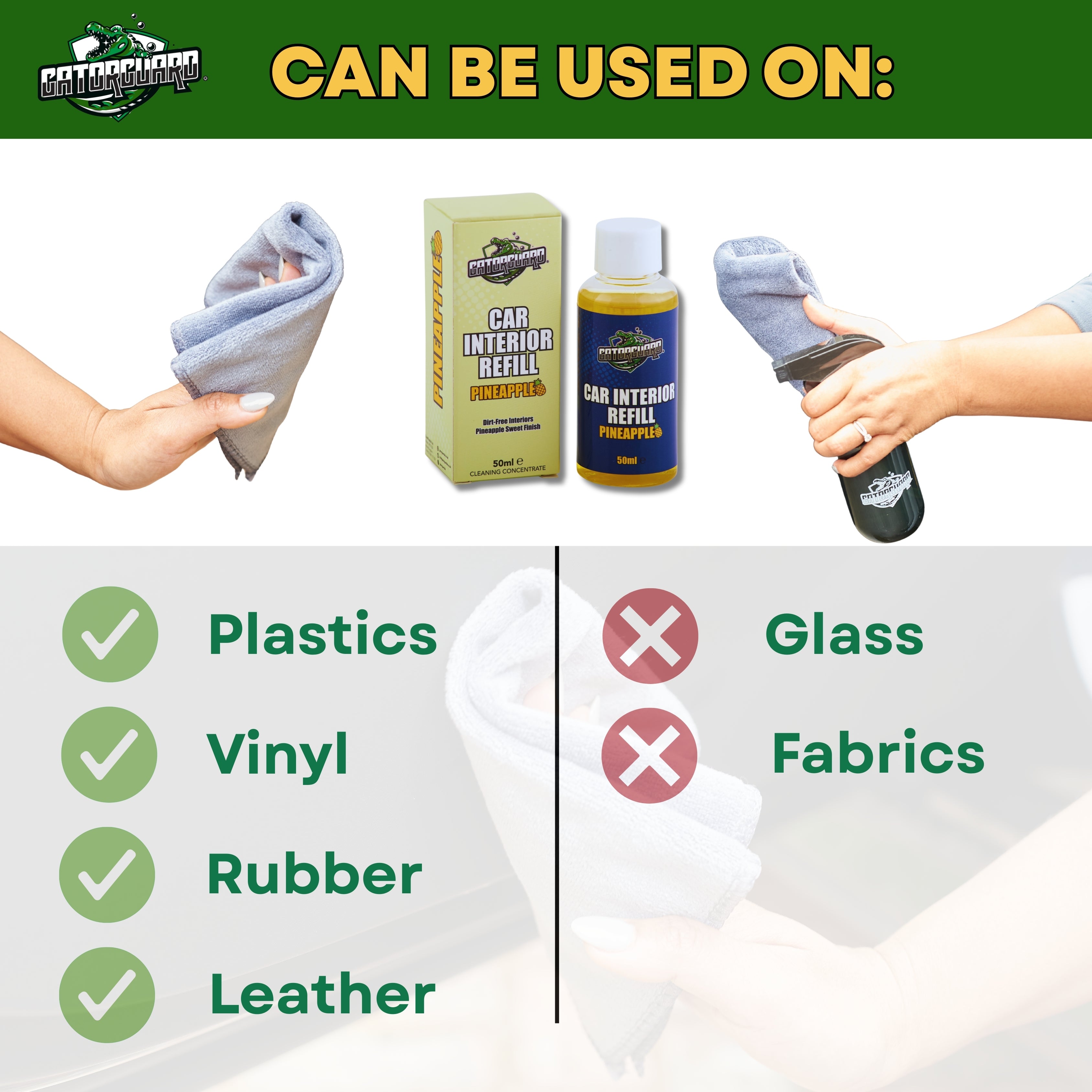 The Gatorguard Pineapple Refill 50ml is a concentrated solution designed to replenish your Gatorguard reusable spray bottle. Infused with a tropical pineapple scent, this refill keeps your car’s interior surfaces, such as dashboards, leather, and plastics, clean and vibrant. Perfect for customers who have purchased the Gatorguard Car Interior Starter Kit and want to continue using the pineapple fragrance.